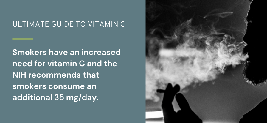 Smokers have an increased need for vitamin C and the NIH recommends that smokers consume an additional 35 mg/day. Pregnant women should also get more vitamin C, as it is essential for the development of the fetus. The RDAs for vitamin C during pregnancy and lactation are 85mg and 120 mg/day.